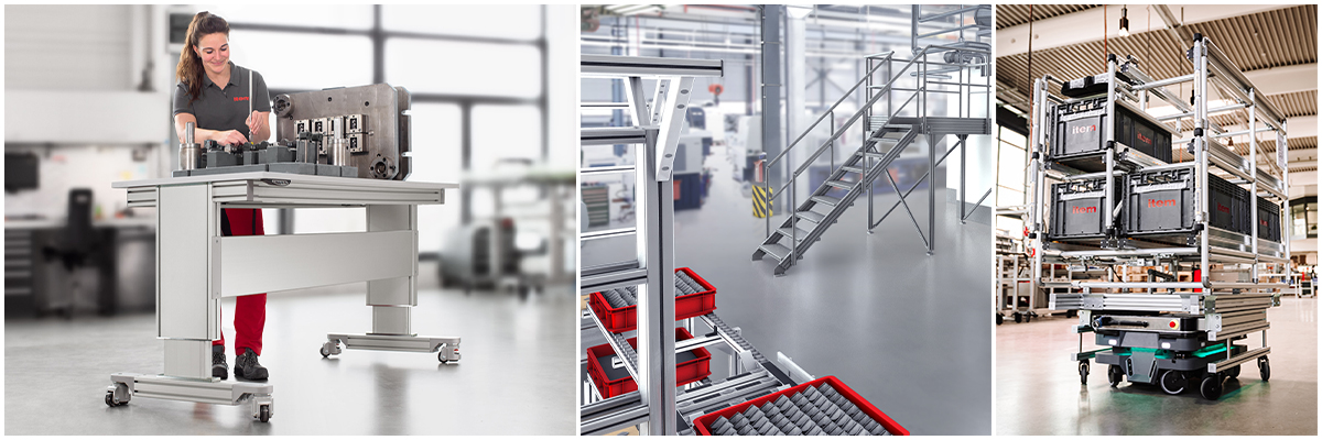The item Building Kit System has been used in industry for 50 years. Discover a wide range of practical application examples – from ergonomic work benches and transport trolleys to stairway systems. With item, your idea becomes an innovative solution that is perfectly tailored to your individual requirements.