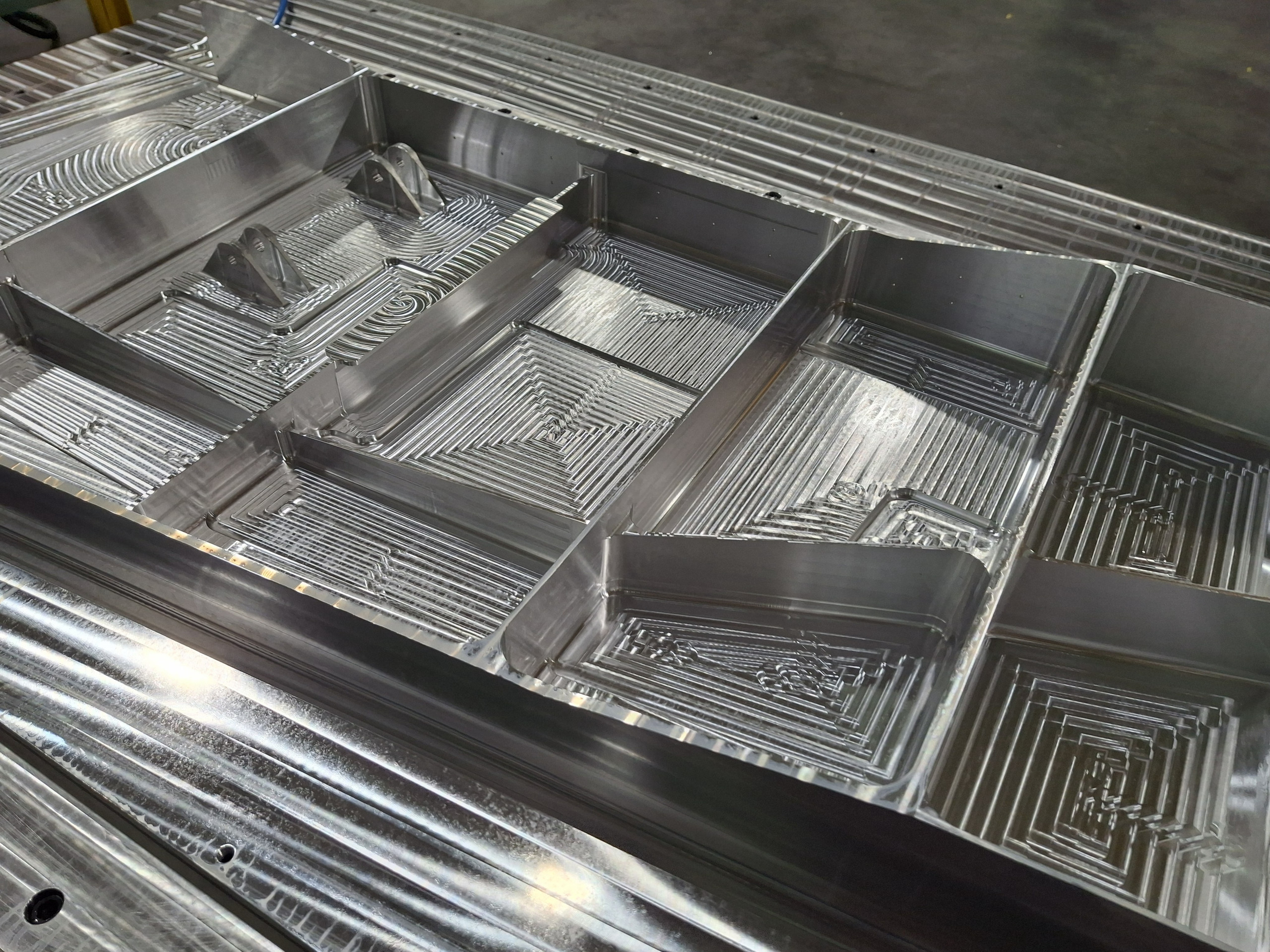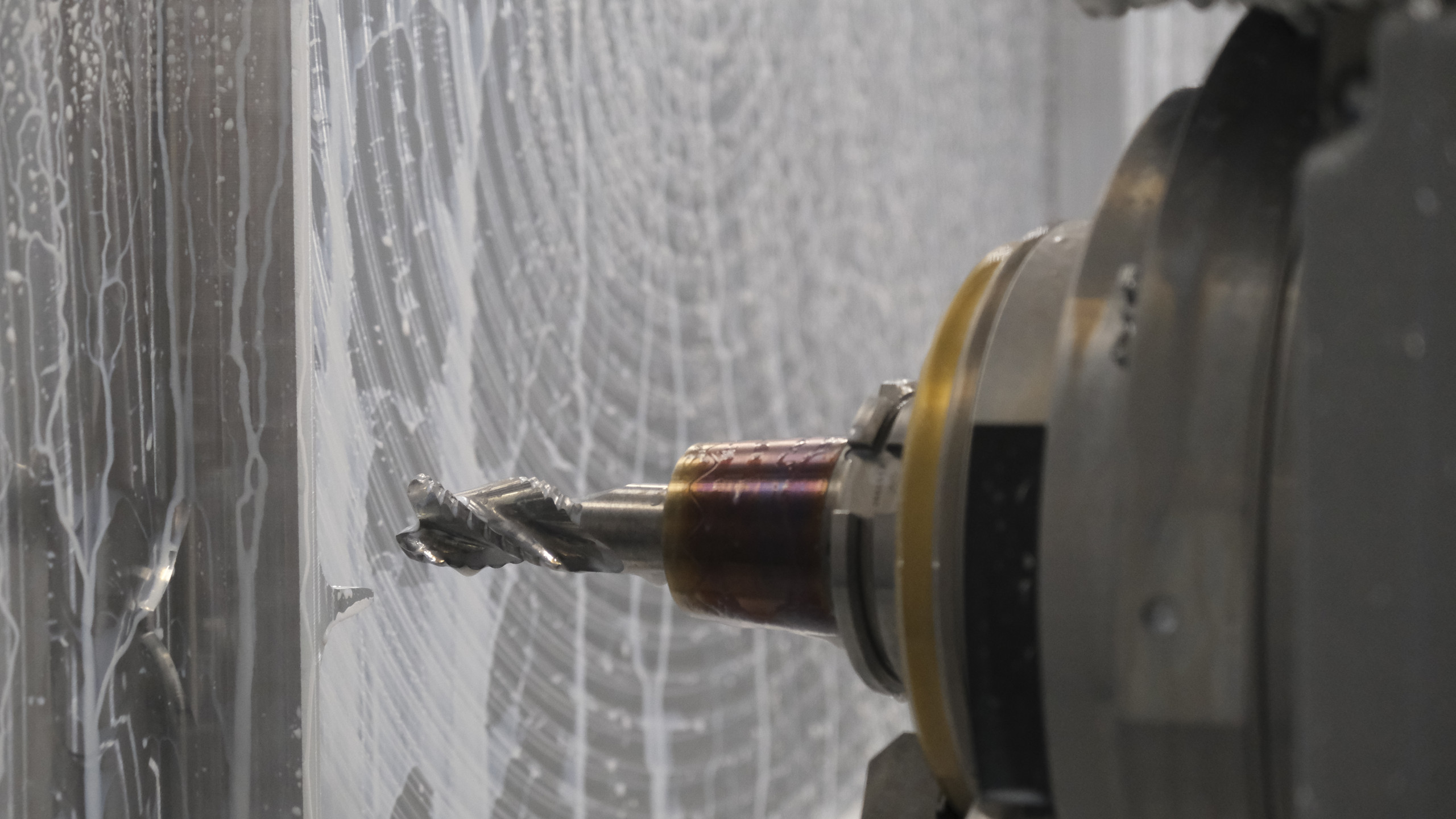 The solid carbide high volume milling cutter OptiMill-Alu-Wave from MAPAL was used for milling the pockets. It achieved peak chip volumes of nearly 12 litres per minute (approx. 3.2 gal/min). In the corners, it comes so close to the final geometry that finishing can be carried out directly without an intermediate step.